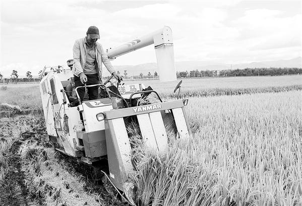 当日,云南省大理市“洱海留香”绿色水稻种植基地开镰。近年来,云南农垦集团在大理市环洱海流域开展规模化绿色有机优质水稻种植,打造出特色大米“云粮·洱海留香”。新华社发(梁志强 摄)