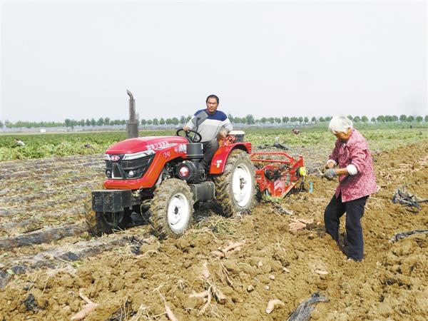 10月24日,在沈丘县付井镇王营村某订单蜜薯种植基地,一辆红薯收获机在田间来回穿梭,工人忙着捡拾蜜薯,一片繁忙景象。