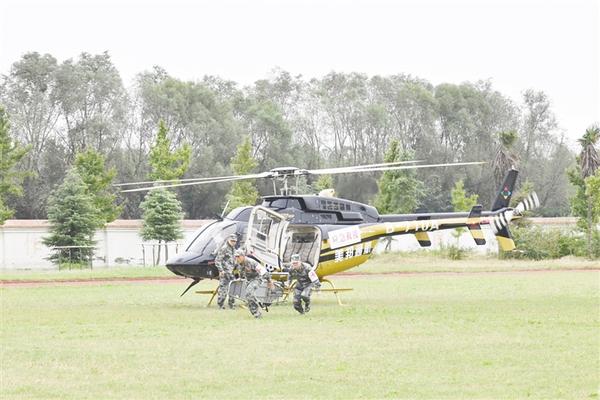 随着空中传来直升机螺旋桨的声音,一行人来到运动场观礼台观看实地演练课目。救援直升机在现场盘旋,侦察情况后平稳降落,西华县民兵救援分队队员迅速下机,携带担架和医疗箱,匍匐前进至伤员身边进行紧急包扎和救治,并将伤员通过直升机送至医院,完成救援任务。