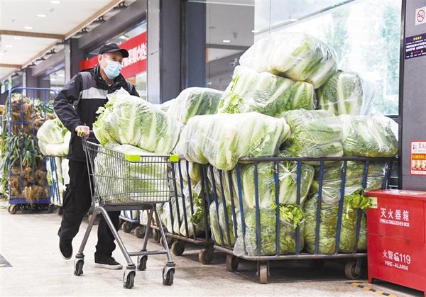 11月2日,在超市发双榆树店,市民在选购大白菜。当日,北京超市发连锁各直营店冬储菜上市。据了解,冬储菜采用产地直采的方式供应市场。在销售冬储菜期间,北京超市发连锁50家直营店每天将提供150余吨大白菜、30余吨大葱。冬储菜供应将持续至11月4日。新华社记者 任超 摄