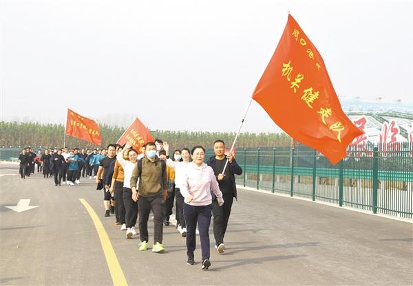 本报讯 (记者 宋风 文/图) 为营造浓郁的全民健身氛围,10月29日,周口港区在辖区堤顶路举办沿沙颍河绿色出行健步走活动(如图)。港区党委委员、纪委书记李素芹,市总工会党组成员、副主席郭建军参加活动并致辞,港区二级调研员张东立主持活动。