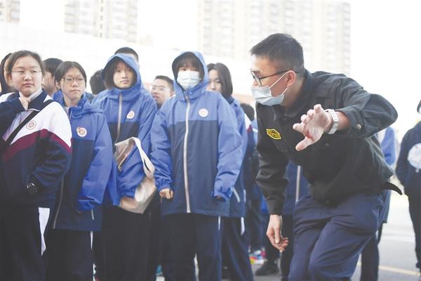 11月8日,消防安全宣传教官(右一)在长沙市明德中学向学生演示如何在火灾中逃生。当日,为迎接 “119消防宣传日”,湖南省长沙市明德中学开展消防安全知识进校园活动,让学生们通过消防知识宣讲、火灾逃生体验等环节提升消防安全意识。新华社发