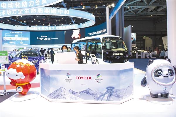 11月7日在第四届进博会汽车展区丰田展台拍摄的的“冰墩墩”和“雪容融”。