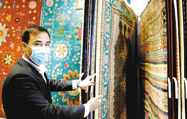 11月6日,阿富汗参展商阿里·法伊兹在第四届进博会推介阿富汗手工羊毯。