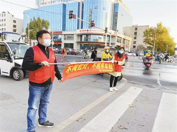 本报讯 (记者 王凯 文/图) 及时劝阻、指挥通行……根据交通信号灯的不断变化,市应急管理局的交通劝导志愿者步调一致,手中的旗帜不断抬起落下(如图),虽然是上班高峰期,但在志愿者有效劝导下,路口的交通秩序井然。