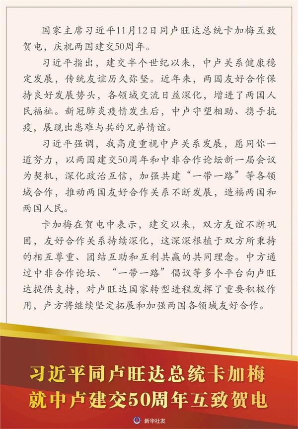 习近平同卢旺达总统卡加梅就中卢建交50周年互致贺电