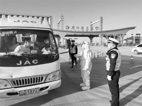 连日来,周口交通管理支队民警全力配合卫生防疫、交通等部门设置疫情防控点,日夜坚守,实行24小时联防联控,仔细排查,认真登记,不放过一个可疑车辆及人员。他们对进出扶沟的车辆和人员进行劝返,对高铁下站旅客严格登记、筛查,引导和保障每一辆运输防疫物品车辆顺利通行,为人民群众筑起一道安全屏障。 记者 侯国防 摄