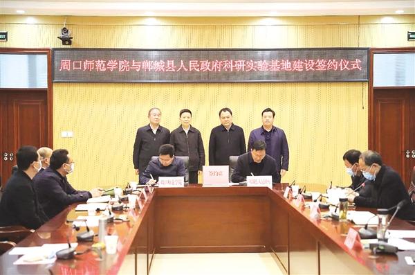 周口师范学院校长臧振春和县长董鸿共同为科研实验基地项目建设签约。