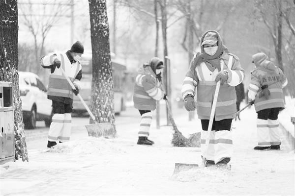 11月22日,环卫工人在哈尔滨市的街道上进行清雪作业。