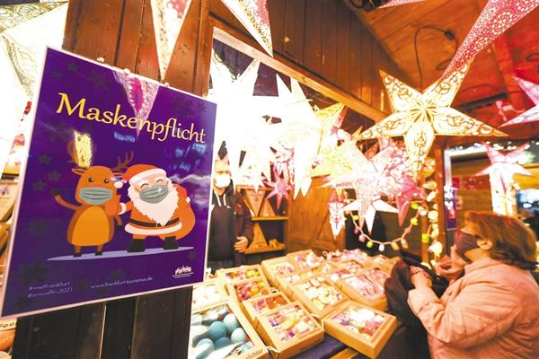 11月22日,德国法兰克福圣诞市场一处摊位旁贴着“必须戴口罩”防疫提示牌。受新冠疫情影响,德国柏林、法兰克福等地的圣诞市场有的取消,有的在较为严格的防疫措施下开放。新华社记者 逯阳 摄