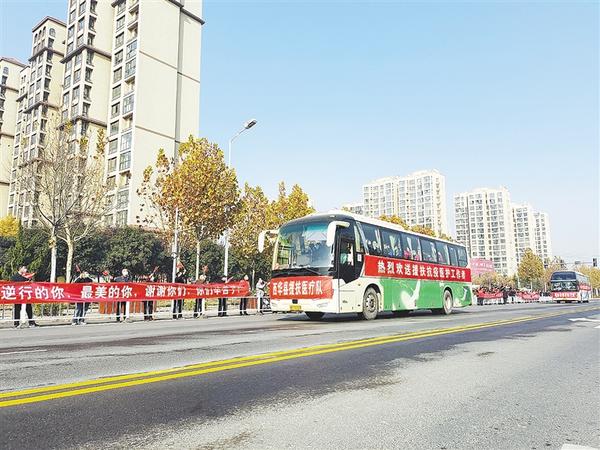 11月26日上午,在扶沟县城桐丘路南段两侧,数百名志愿者挥舞着小红旗,目送援助扶沟抗疫医疗队返程。(相关报道见第二版)
