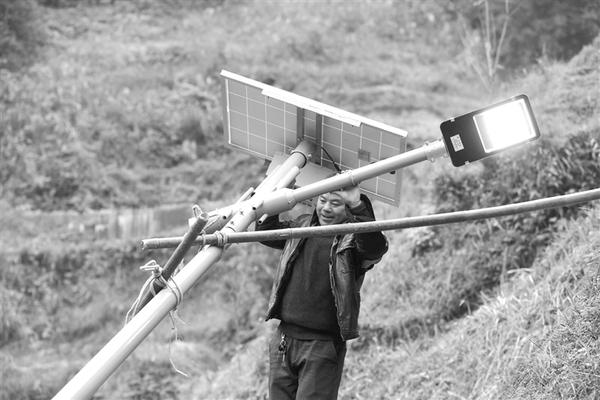 广西融水苗族自治县杆洞乡党鸠村村民在安装太阳能路灯(2020年12月7日摄)。