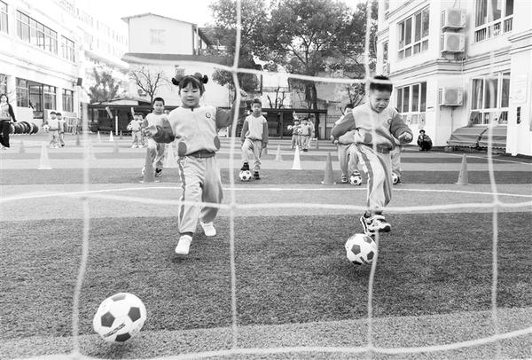 12月8日,孩子们在参加带球射门比赛。12月9日是世界足球日,浙江省湖州市长兴县中心幼儿园为此举办了为期一周的“足球特色周”活动,足球操、带球绕桩、带球射门、走走停停、占圈、翻翻乐等,趣味十足的足球游戏让全园700多名小朋友“乐翻天”。新华社发