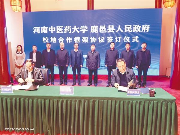 仪式上,王玉超介绍了鹿邑中医药和职业教育发展情况。张加民代表河南中医药大学、张国庆代表鹿邑县人民政府签订校地合作框架协议。