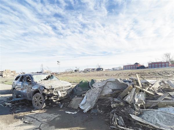 12月11日,在美国肯塔基州梅菲尔德,一辆汽车在龙卷风袭击中损毁。据美国媒体11日报道,美国中部6个州10日夜间遭遇至少30场龙卷风袭击,截至目前已造成80多人死亡。新华社发