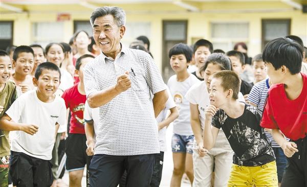 ① 8月6日,马维帅(前)教孩子们跳“陕北秧歌”。在黄土高原山沟沟深处的陕西省子洲县周家硷镇,马维帅30年来义无反顾坚持办学,呵护着留守孩子们的童年。