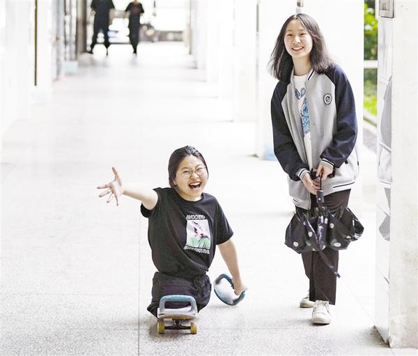 ③ 5月10日,蒋张子怡(左)和同学在学校的走廊聊天。蒋张子怡是江西上饶中学高中一年级的学生。2010年一场车祸夺去了她的双腿,如今的她只能依靠滑板代步,用双手前行,为此,大伙都称她“滑板姑娘”。她有着广泛的兴趣爱好,喜爱舞蹈、播音主持和写作,希望可以成为一个多才多艺的人。