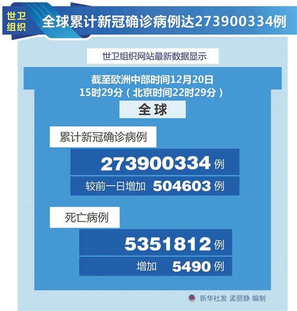 世卫组织:全球累计新冠确诊病例达273900334例
