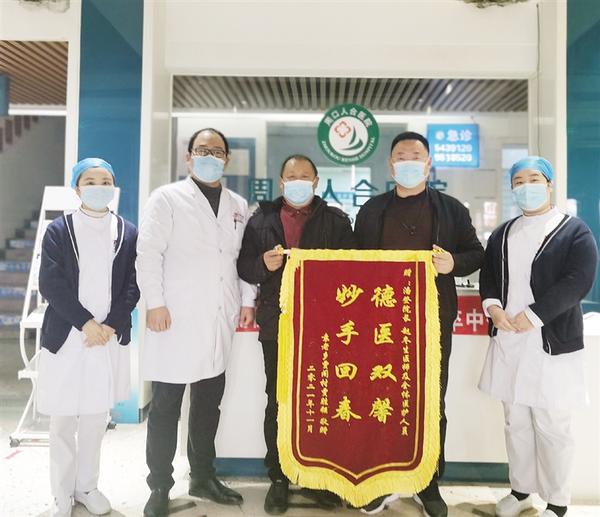 本报讯 (记者 朱东一 文/图)12月10日,已康复出院的患者及家属将一面写着“德医双馨,妙手回春”的锦旗送到周口人合医院院长潘登手中,表达对医院及全体医护人员的感激之情(如图)。