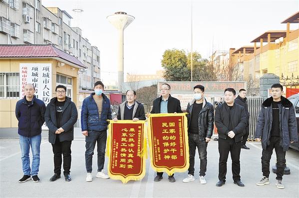 本报讯 (记者 张志新 通讯员 邵佩佩 程彰 文/图) “没有想到市住建局这么快就为我们讨回了血汗钱,这下我们就可以安心回家过年了!”12月27日,农民工张华伟、刘军伟等人将写有“秉公执法认真负责 心系民工热情周到”和“国家的好干部 民工的保护神”字样的锦旗送到项城市住建局(如图),以此感谢该局领导和工作人员不辞辛劳为他们讨回40万元工资款。
