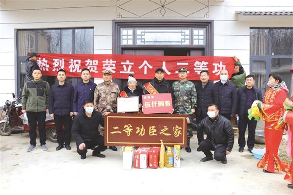 12月24日上午,西华县委常委、县人武部上校政委涂友佳,县人武部上校部长张大钊等在喜庆的锣鼓声中,来到艾岗乡洪山庙村某部现役军人刘义家,将“二等功臣之家”牌匾、喜报、5000元奖金及慰问品送到军属手中。