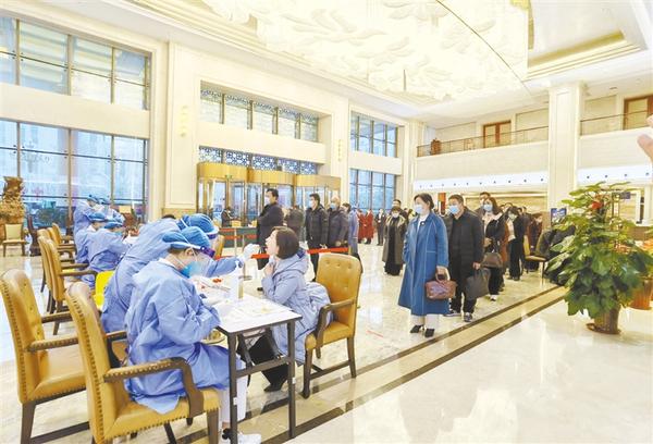 在周口代表团入住地紫荆山宾馆,大会组委会要求与会人大代表在出发地和入住地分别进行核酸检测,入住地两次检测结果均呈阴性后方可参加会议。记者 王映 摄
