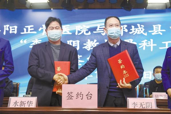本报讯(记者 徐松 通讯员 张洋 谢孟伶 文/图)2021年12月23日上午,洛阳正骨医院与郸城县第二医疗健康服务集团县中医院签约共建“中原名医李无阴教授骨科工作室”(如图)。中原名医李无阴教授专家团队,周口市卫健委党组成员、副主任,郸城县卫健委主任付登霄,郸城县中医院院长水新华及医院全体班子成员参加签约仪式。