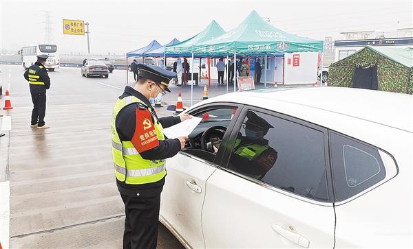 为有效应对当前严峻疫情形势,严防疫情输入风险, 从1月3日晚开始,周口市交通运输综合行政执法支队高速一大队执法人员入驻安罗高速周口西站疫情防控卡点开展疫情防控工作。他们24小时驻守一线,严格查验所有出站人员的行程码、健康码和48小时核酸检测证明,对未持核酸检测证明的人员要求其现场进行核酸采样、签承诺书后允许通行,为守护全市人民的健康安全尽职尽责、贡献力量。图为周口市交通运输综合行政执法支队高速一大队执法人员正在疫情防控卡点值勤。记者 孙安平 摄