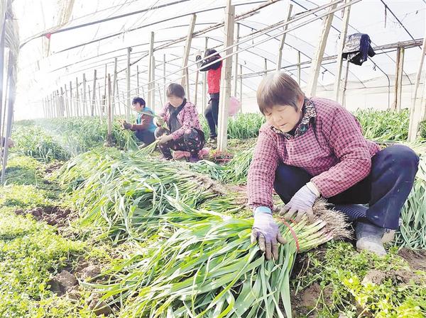 2021年12月30日,淮阳区城关回族镇贾庄行政村蔬菜大棚种植基地内,4位村民正忙着把长势喜人的蒜苗一棵棵挖出、分拣、打捆、装运……这些带着泥土芳香的蒜苗即将运往北京、上海等大城市的超市,走上城里人的餐桌。近年来,淮阳区通过“引品种、抓技术,找销路”因地制宜发展高效、绿色产业,让绿色蔬菜大棚成为农民增收致富的“金山银山”。记者 侯俊豫 摄