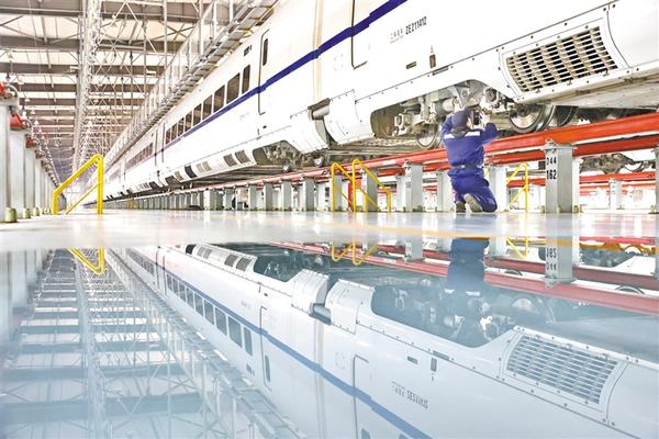 1月9日,一位地勤机械师在江苏南通动车运用所存车库检查车侧转向架部件。