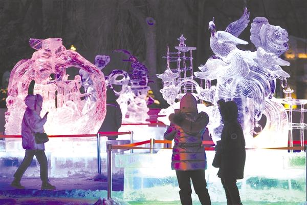 1月8日,游客在哈尔滨冰灯艺术游园会园区欣赏冰雕作品。