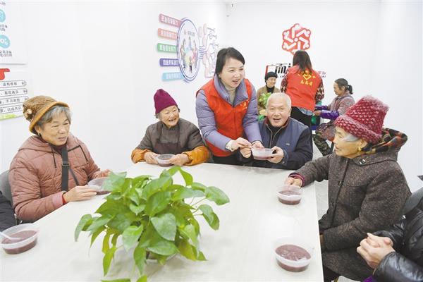 1月10日,党员志愿者为老人们分发腊八粥。