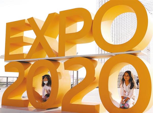 1月9日,两名儿童在阿拉伯联合酋长国迪拜世博园门口拍照。