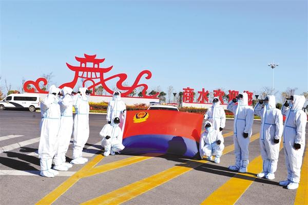 近日,商水县公安局奋战在疫情防控一线的民警、辅警举起右拳,向警旗庄严宣誓:踔厉奋发、笃行不怠,乘势而上、继续奋斗,坚决做人民群众生命财产安全的捍卫者。图为宣誓现场。 记者 马治卫 通讯员 郭利军 摄