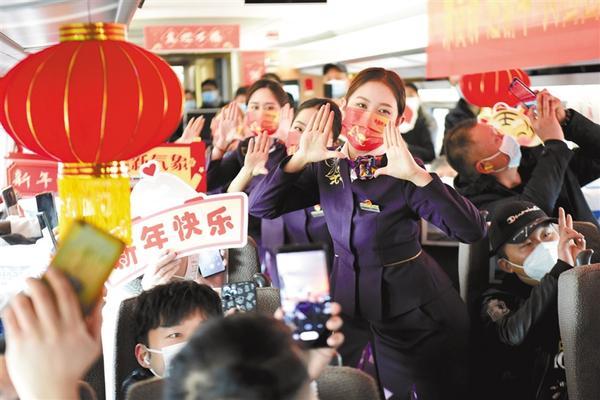 1月16日,合肥客运段工作人员在G7162次列车上为旅客表演节目。临近春运,中国铁路上海局集团有限公司合肥客运段乘务员志愿者登上六安至上海虹桥的G7162次列车,为旅客表演文艺节目,让旅途充满温情。新华社发