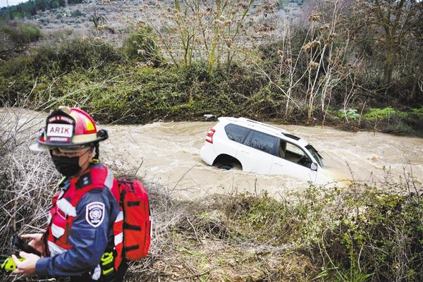 1月16日,一辆汽车被困耶路撒冷附近一条水位暴涨的河流中。