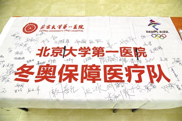 这是医疗队员签字的医疗队旗(1月17日摄)。当日,北京大学第一医院冬奥保障医疗队举行出征仪式。这支医疗队的47名成员来自25个临床科室,将在首都体育馆为北京冬奥会短道速滑比赛和花样滑冰比赛提供医疗保障。新华社发