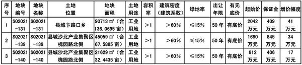 备注: SQ2021-131号:1.宗地“五通一平”(宗地外通路、通电、通讯、通上水、通下水,宗地内土地平整);2.行政办公及生活服务设施用地不得超过工业项目总面积的5%;3.依照河南省政府第200号令,该地块应按照其一次性规划新建或者新增地上总建筑面积的6%比例修建防护级别6级以上防空地下室;4.准入行业:生物智能发电;5.由辖区政府负责按时向受让人交付土地。SQ2021-139号:1.宗地“五通一平”(宗地外通路、通电、通讯、通上水、通下水,宗地内土地平整);2.行政办公及生活服务设施用地不得超过工业项目总面积的5%;3.依照河南省政府第200号令,该地块应按照其一次性规划新建或者新增地上总建筑面积的6%比例修建防护级别6级以上防空地下室;4.准入行业:金属制业品;5.由辖区政府负责按时向受让人交付土地。SQ2021-140号:1.宗地“五通一平”(宗地外通路、通电、通讯、通上水、通下水,宗地内土地平整);2.行政办公及生活服务设施用地不得超过工业项目总面积的5%;3.依照河南省政府第200号令,该地块应按照其一次性规划新建或者新增地上总建筑面积的6%比例修建防护级别6级以上防空地下室;4.准入行业:聚酯网制造业.5.由辖区政府负责按时向受让人交付土地。