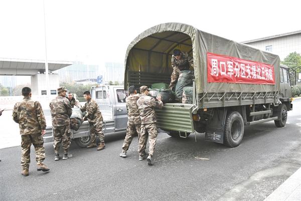 “装车!”在机关营区广场上,官兵们忙碌不停,把从军分区机关和川汇区、商水县、西华县等人武部调拨的一包包帐篷整整齐齐地装上运输车,紧急送往沈丘县。