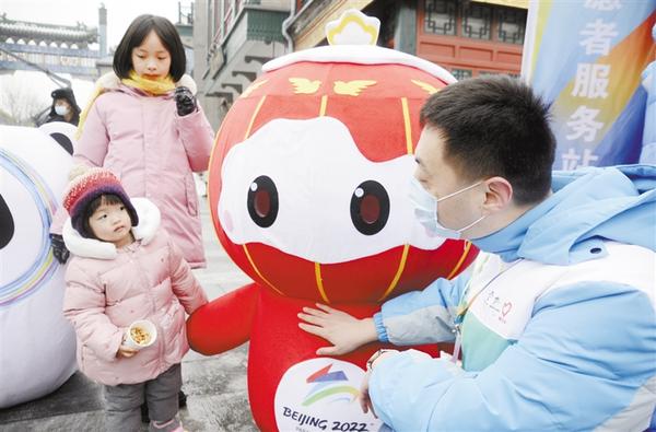 ① 1月23日,城市志愿者王兴在北京前门大街开始为游人介绍冬奥场馆、提供旅游指南等志愿服务。
