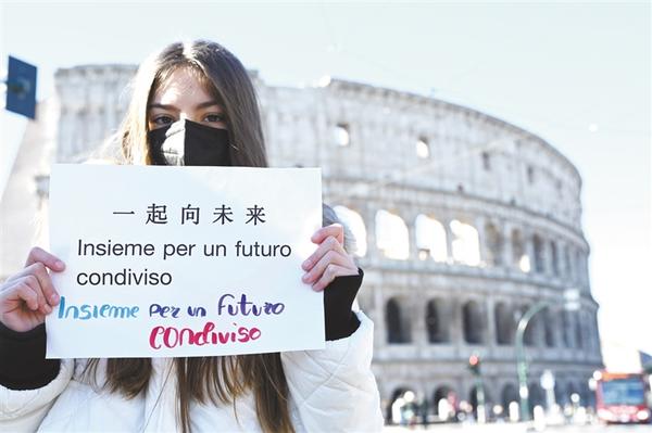 ② 1月15日,在意大利罗马,意大利中学生利维娅手举“一起向未来”的主题口号,祝福北京冬奥会。