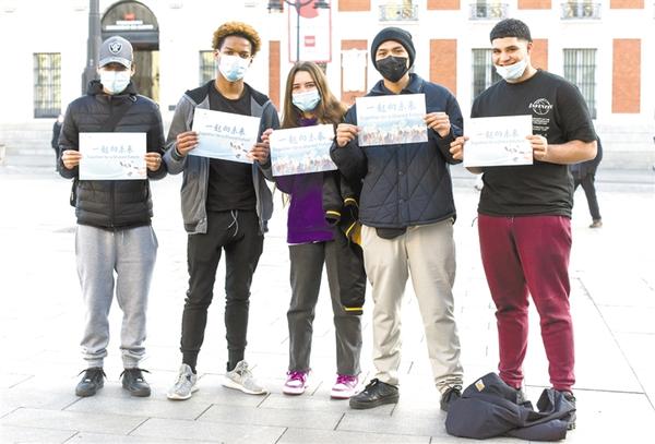 ③ 1月18日,在西班牙马德里,青年手举“一起向未来”的主题口号,祝福北京冬奥会。