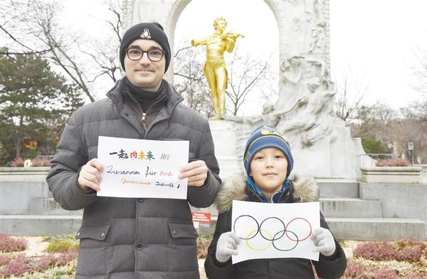 ⑤ 1月15日,奥地利维也纳城市公园内的施特劳斯雕像前,一对父子迈克尔·加斯佩里(左)和马特奥·加斯佩里手举“一起向未来”的主题口号和奥运五环标志,祝福北京冬奥会。