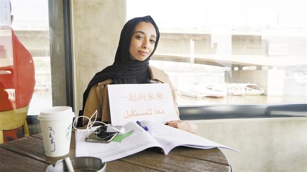 ④ 1月18日,在埃及开罗,法律学校学生纳吉斯手举“一起向未来”的主题口号,祝福北京冬奥会。
