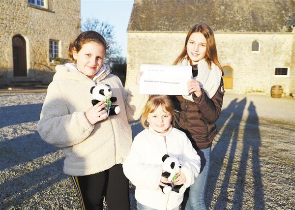 ⑥ 1月14日,在法国芒什省梅奥蒂市,10岁的安娜埃尔·玛丽昂、5岁的卡米耶·玛丽昂和12岁的诺拉·玛丽昂(从左至右)手举“一起向未来”的主题口号,祝福北京冬奥会。