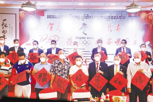 1月23日,参观展览人员合影留念。当日,柬埔寨华侨华人在柬埔寨首都金边组织“贺冬奥、迎新春,为北京2022冬奥会雄姿喝彩”书法图片展。展览展出与北京冬奥会有关的238张照片和100多幅书法作品,为期两个月,旨在为北京冬奥会加油。 新华社发