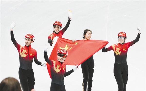 2月5日,中国队选手在比赛后庆祝。当日,在首都体育馆举行的北京2022年冬奥会短道速滑项目混合团体接力决赛中,中国队夺得冠军。新华社记者 王毓国 摄