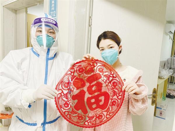 除夕、春节、隔离点、疫情防控,这几个词相遇总让人萦绕心头点点愁,白衣天使、健康守护、同吃饺子、共庆佳节,再加上县领导慰问、送福字、贴春联、贴窗花、看春晚、大礼包……新春佳节,郸城县让集中隔离点的隔离人员隔离不隔爱、隔离不隔温情。医护人员与隔离人员一起贴春联、贴窗花,还给每位隔离人员准备了新年大礼包,与隔离人员共吃年夜饭,为隔离人员录制祝福视频传给他们的家人,精心准备祝福和感谢信,在整点时刻给隔离人员发红包,让隔离点的126名隔离人员度过了一个别样的节日。