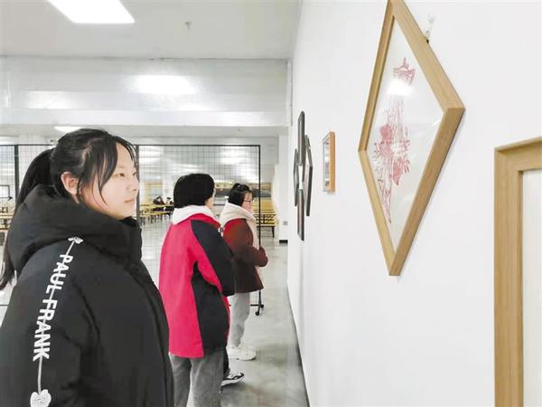 在教学实践中,王海英围绕剪纸的理论和实践操作进行面对面讲解、手把手指导。学生们手持剪刀,在红色的纸上穿梭舞动,一件件剪纸作品在他们手中完成。这些剪纸作品在餐厅展出后,受到全校师生的好评。