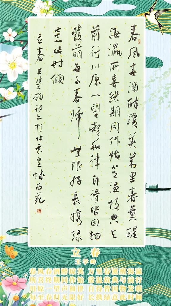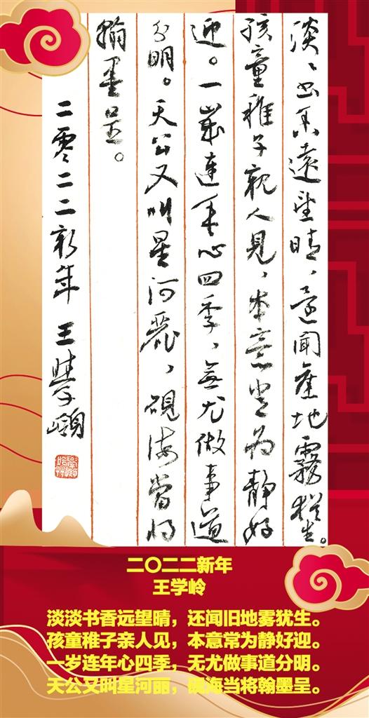 王学岭是书家,亦是诗人。2022年春节,他敏锐捕捉到春的气息,内心升起一派欣欣向荣的美丽图景,借用传神的诗句、深邃的书艺,把这份欣喜传达。